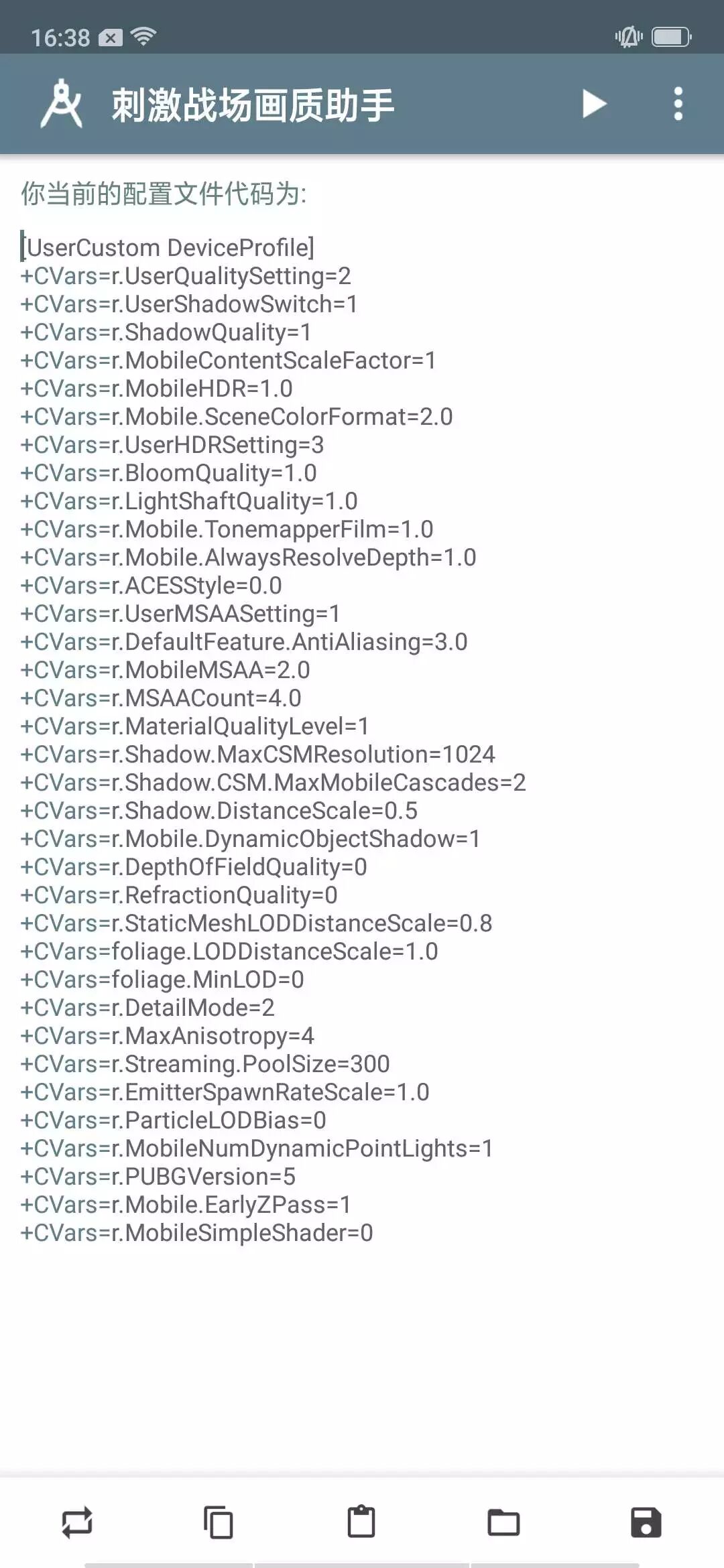 最后,即可看到配置文件代码的限制编辑界面。这个方法就会失效 。吃鸡刺激 好在有开发者制作了一款名为“刺激战场画质助手”的手游APP来简化修改步骤。